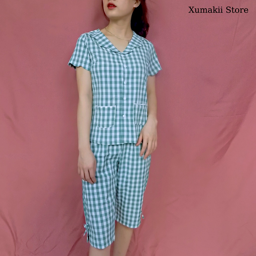 Bộ Pizama Nohk áo cộc quần ngố kẻ caro màu xanh mint chất thô cao cấp free ship